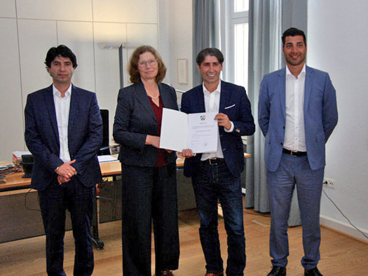 Regierungspräsidentin Anne Lütkes hat die Anerkennungsurkunde für die Stiftung „Aramean Charitable Foundation-Stiftung“ mit Sitz in Düsseldorf an den Geschäftsführer und Alleingesellschafter der Suryoyo Holding GmbH Herrn Zeki Anter übergeben.